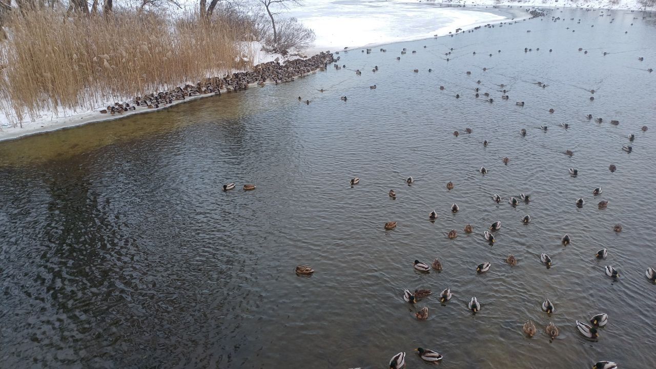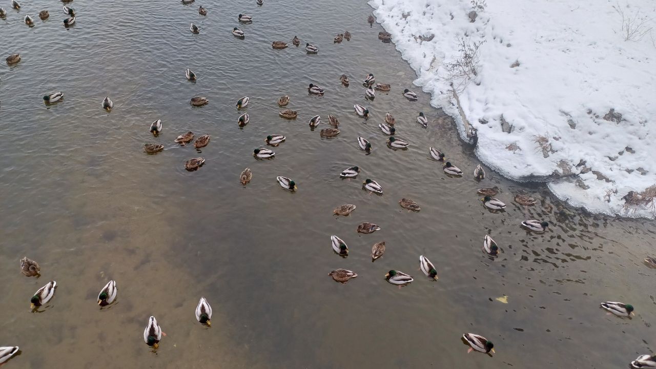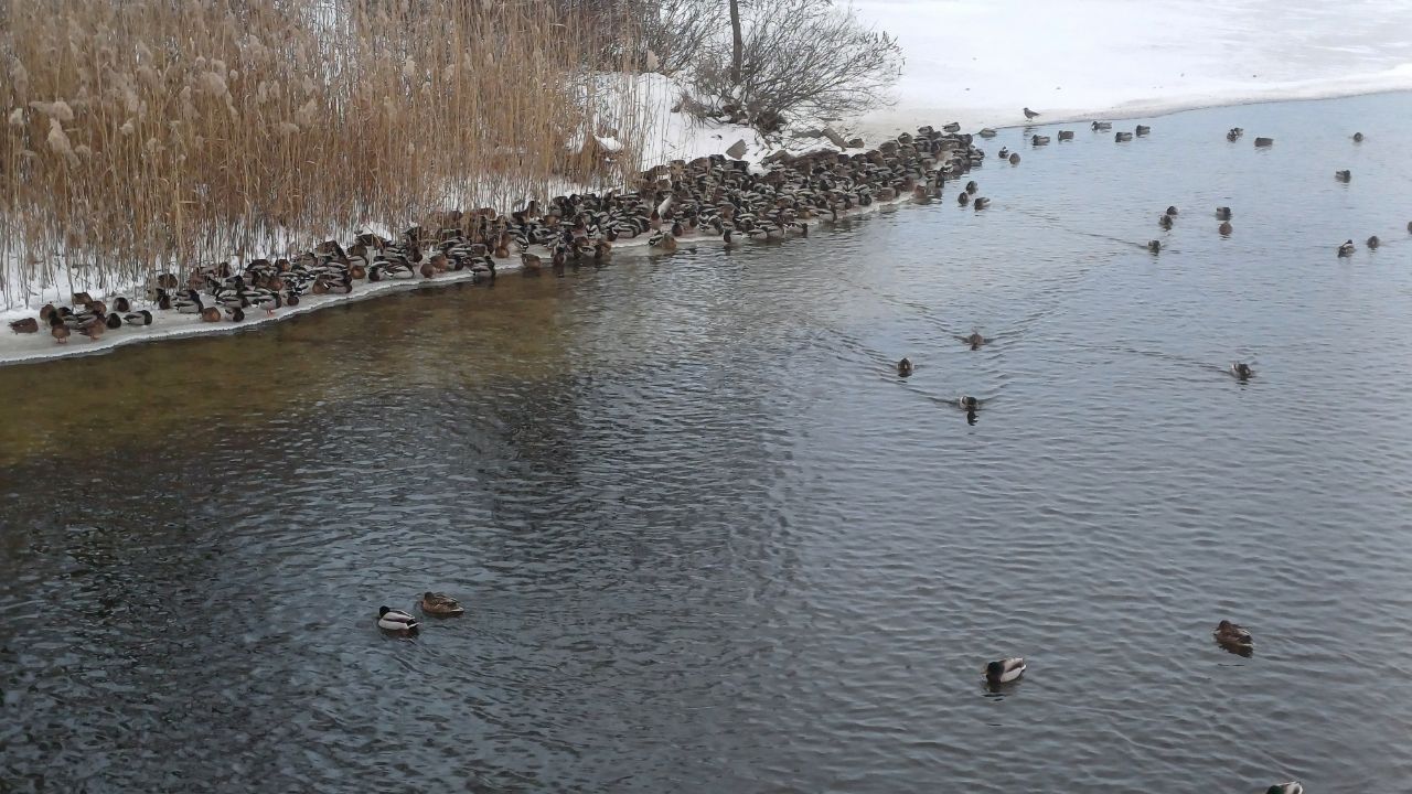 Кілька сотень птахів розмістилися просто на березі, ще стільки ж тримаються у воді. Качок настільки багато, що вони зосереджені в одному місці, утворивши своєрідне «пташине скупчення» вздовж річки.