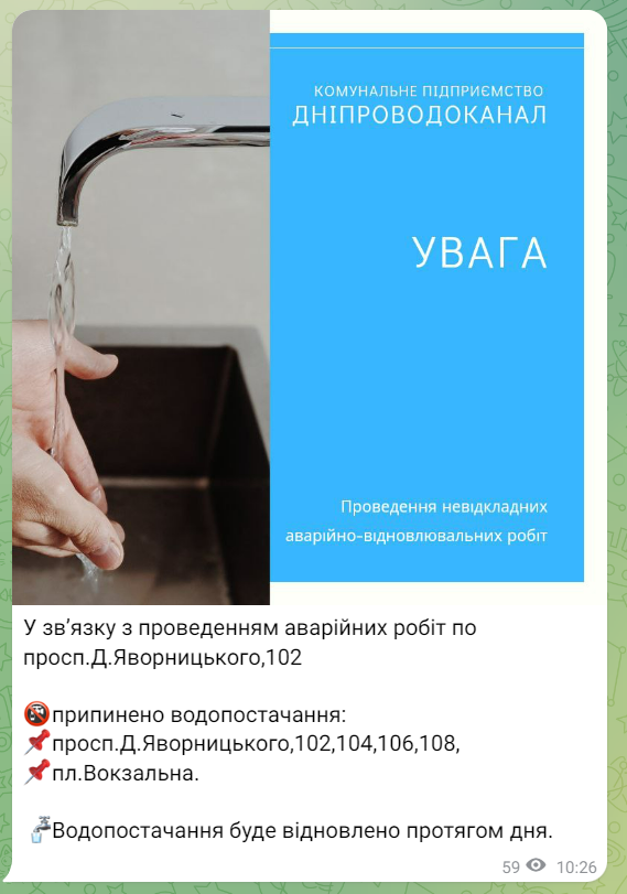 Оновлено о 10:30: у КП "Дніпроводоканал" повідомили, що у зв’язку з проведенням аварійних робіт на просп. Д. Яворницького, 102 припинено водопостачання: