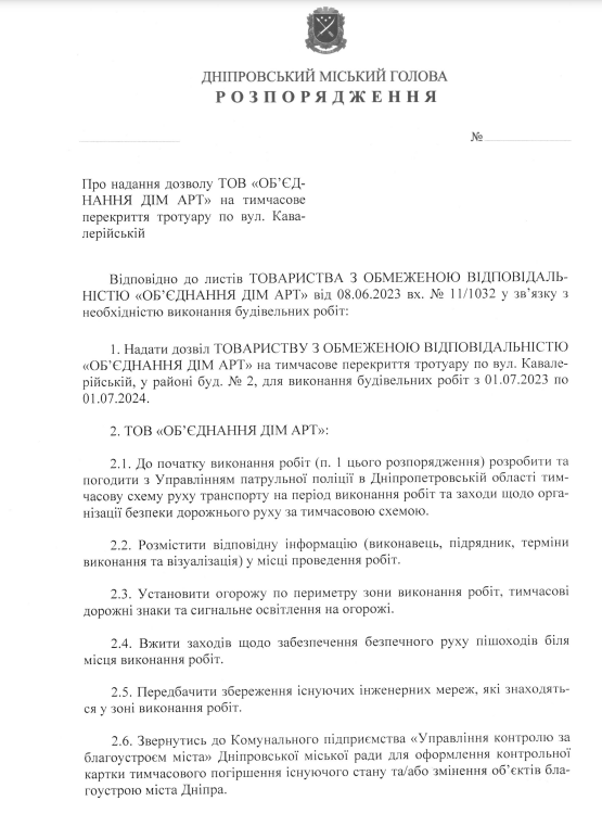 У Дніпрі планують перекрити тротуар на вулиці Кавалерійській, у районі будинку №2.