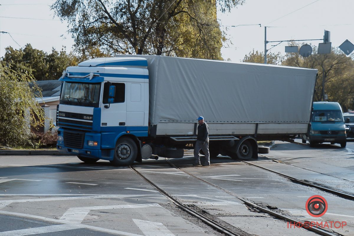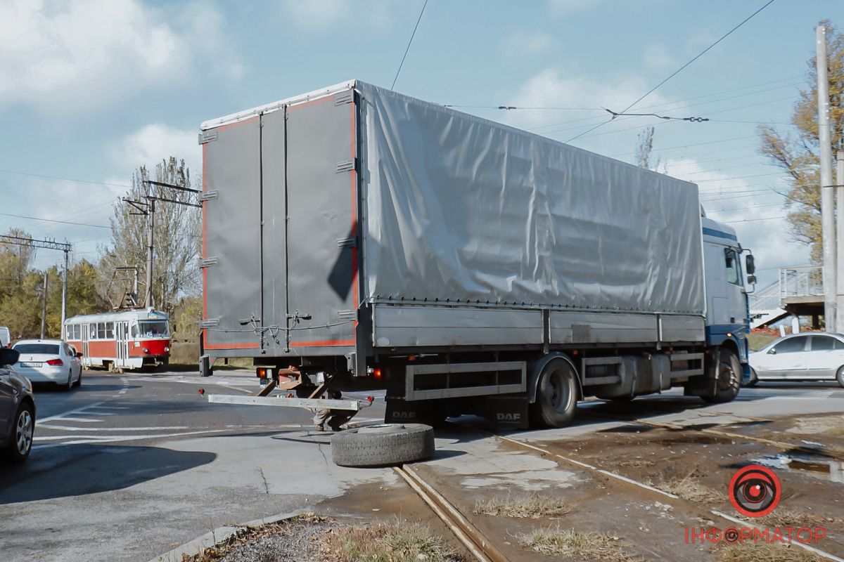 Зазначається, що вантажівка DAF виїжджала з вулиці Бажова, заїхала на трамвайну колію і в цей момент в неї відпало колесо. Автомобіль перекрив обидві колії, по яким рухались трамваї №6.
