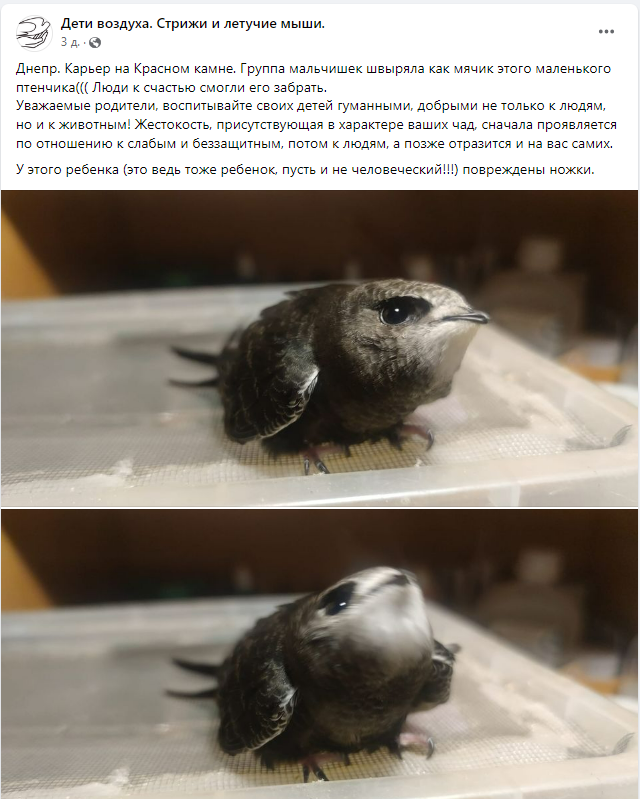 Дніпро. Кар'єр на Червоному Камені. Група хлопчиків жбурляла цю маленьку пташку, як м'ячик. Люди, на щастя, змогли її забрати, - написали містяни.