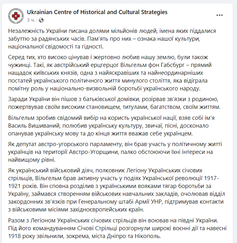 Вільгельм сприяв визнанню українців як нації та чимало зробив, аби підвищити авторитет України на міжнародній арені. Завдяки його старанням Австро-Угорщина стала однією з перших держав у світі, яка визнала незалежність Української Народної Республіки, - зазначили у центрі історико-культурних стратегій.