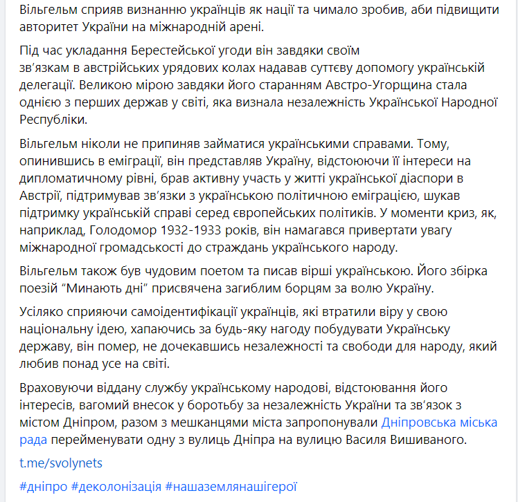 Так, мешканці Дніпра та Український центр історико-культурних стратегій звернулися до Дніпровської міської ради з проханням перейменувати одну з вулиць міста на честь Василя Вишиваного.