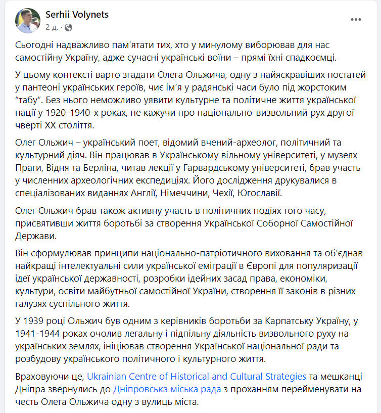 Так, мешканці Дніпра та Український центр історико-культурних стратегій звернулися до Дніпровської міської ради з проханням перейменувати одну з вулиць міста на честь Олега Ольжича.