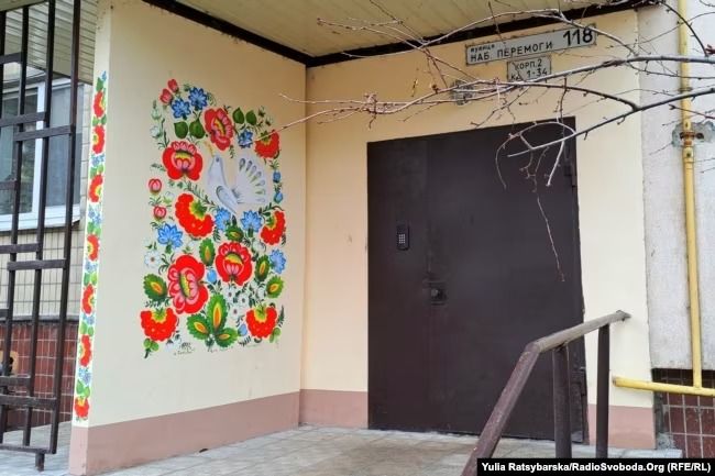 Один із під'їздів багатоповерхівки на Набережній Перемоги, 118, куди в січні влучила російська ракета, розмалювали петриківкою.