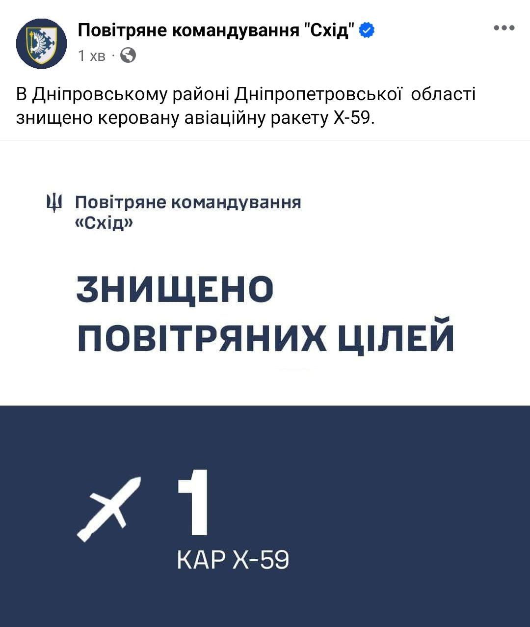 Через деякий час було чутно вибух. Як повідомили у Повітряному командуванні "Схід", у Дніпровському районі збили керовану авіаційну ракету Х-59.