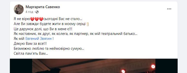 Я не вірю, сьогодні Вас не стало.. Але Ви завжди будете жити в моєму серці. Це дарунок долі, що Ви в мене є! Як наставник, як друг, як колега, як партнер, як мій театральний батько... Як мій Євген Звягін. Дякую Вам за все! Безмежно люблю та неймовірно сумую... Світла пам'ять Вам, - написала Маргарита у себе на сторінці.