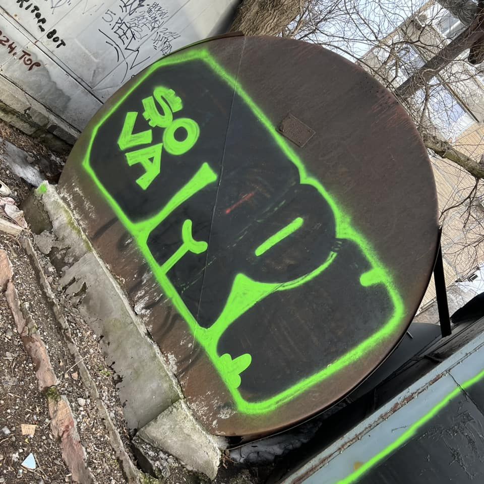 Діогенівський гараж теж страждає від "наскельних" написів місцевих стріт-артерів.