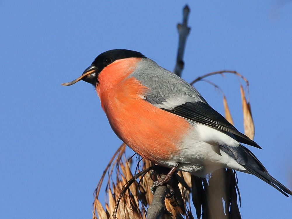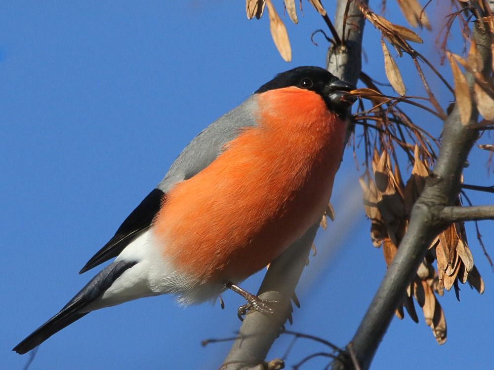 Снігур! Це мачо. У нас в Дніпрі не кожен рік. Інколи вдавалось зняти й без гілочок, але в погану погоду. А ці при сонечку, але ну ви самі бачите. Дякую друзям, що допомогли визначити район пошуку. Далі вже сам. Знайшов, підійшов. Тихенько рухався під деревом, вибираючи ракурс. Але все ж гарно не сиділи. Знайшов по голосу, поклик гучний короткий, мабуть, самочки. А от коли їли - "розмовляли" дуже тихенько, можна поруч пройти та не почути. Зараз вони ясень "топчуть", з'їдять все - перейдуть на бруньки, я на бузку в кінці зими фотографував, - розповів Юрій.
