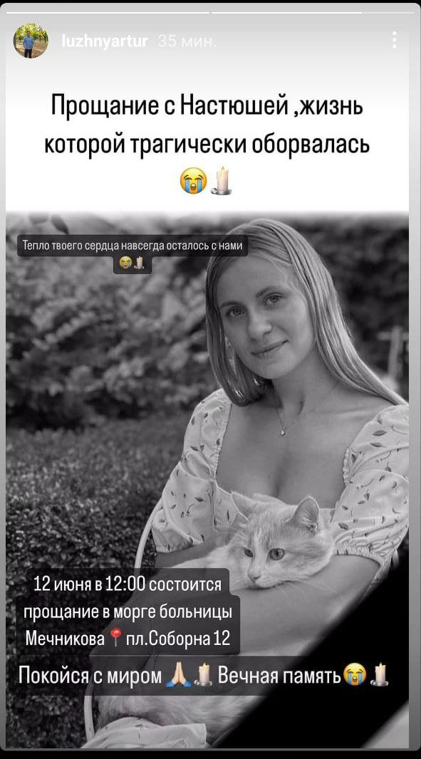 Цієї середи, 12 червня, у Дніпрі попрощаються з 24-річною Анастасією, яка напередодні померла у лікарні. Про це повідомили її друзі.