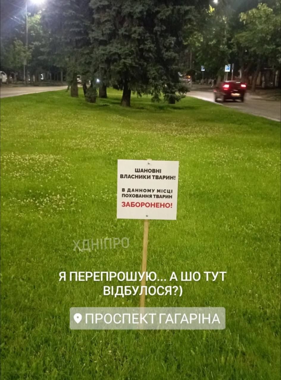 Мешканці Дніпра помітили на проспекті Гагаріна дивну попереджувальну табличку. Власників тварин закликають не ховати своїх улюбленців на газоні посеред проспекту.