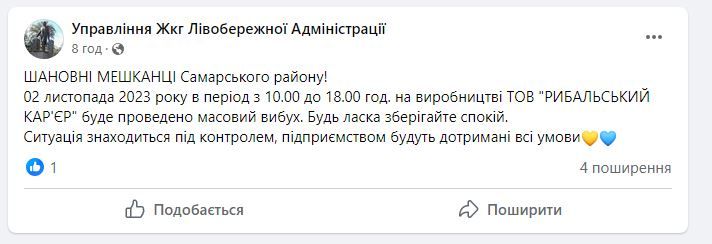 У четвер, 2 листопада, дніпряни можуть почути звуки вибухів. Гучніше всього буде у Самарському районі Дніпра, адже на Рибальському кар'єрі знову проведуть промислові роботи.