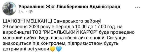 Як інформують в Лівобережній адміністрації, 29 вересня 2023 року на виробництві ТОВ "РИБАЛЬCЬКИЙ КАР'ЄР" буде проведено масовий вибух.