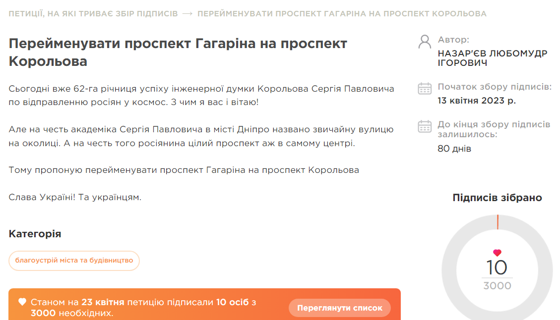 Сьогодні вже 62-га річниця успіху інженерної думки Корольова Сергія Павловича по відправленню росіян у космос. З чим я вас і вітаю! Але на честь академіка Сергія Павловича в місті Дніпро названо звичайну вулицю на околиці. А на честь того росіянина цілий проспект аж в самому центрі, - мовиться в тексті петиції.