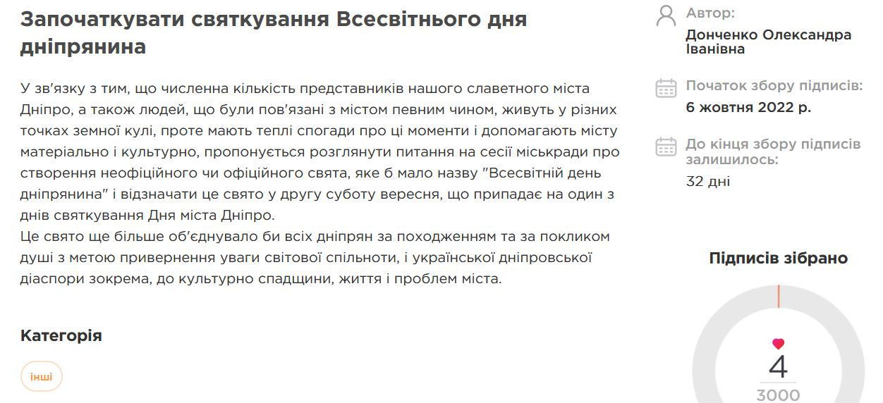 У зв'язку з тим, що численна кількість представників нашого славетного міста Дніпро, а також людей, що були пов'язані з містом певним чином, живуть у різних точках земної кулі, проте мають теплі спогади про ці моменти і допомагають місту матеріально і культурно, пропонується розглянути питання на сесії міськради про створення неофіційного чи офіційного свята, яке б мало назву "Всесвітній день дніпрянина" і відзначати це свято у другу суботу вересня, що припадає на один з днів святкування Дня міста Дніпро, - зазначено в тексті петиції.