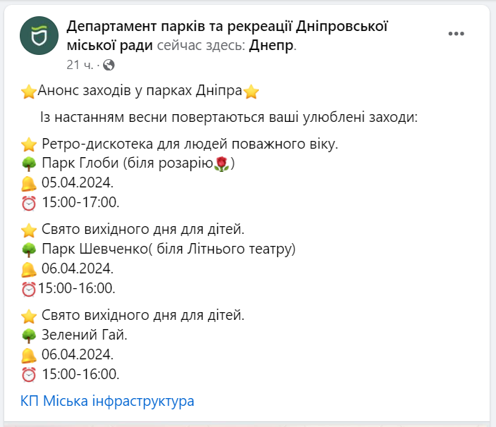 У департаменті парків та рекреації міської ради опублікували анонс заходів на 5 та 6 квітня.