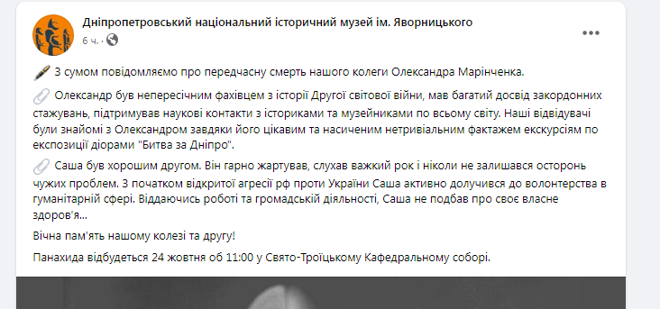 22 жовтня стало відомо про передчасну смерть відомого у Дніпрі історика Олександра Марінченка. Цю інформацію підтвердили і його колеги.