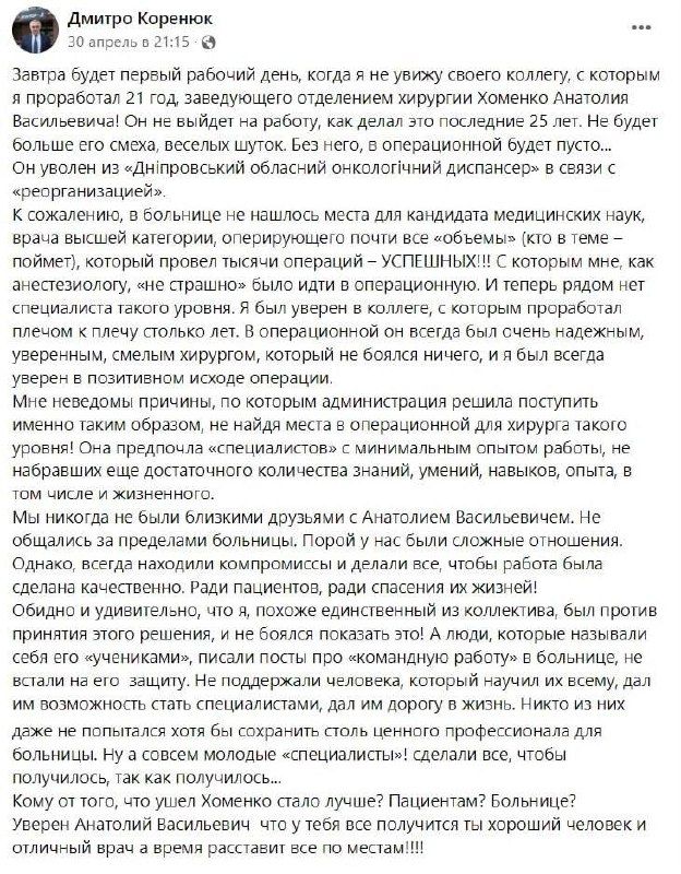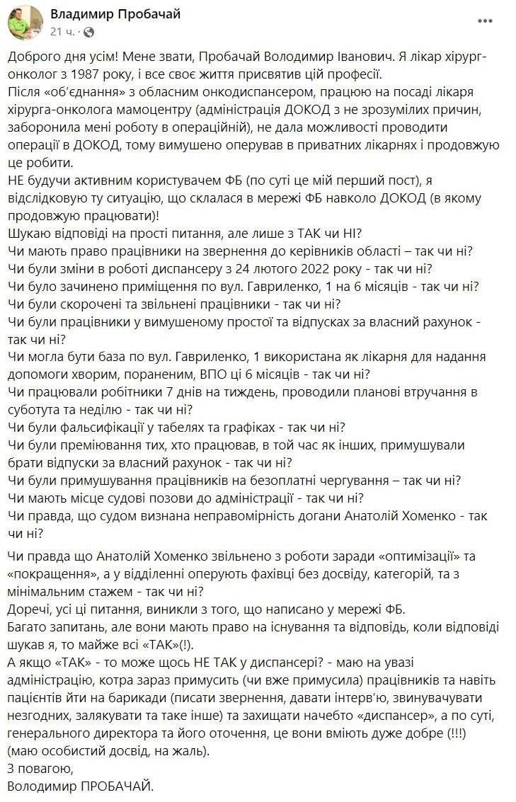 Зокрема, дописи опублікували відомий дніпровський хірург-онколог Володимир Пробачай та завідувач відділення анестезіології онкодиспансеру Дмитро Коренюк. У них йдеться про звільнення співробітників, примусові відпустки та ряд інших гострих проблем.