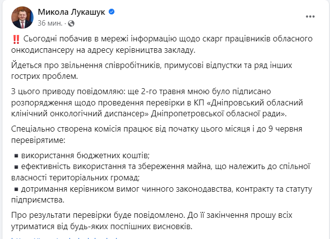 З цього приводу повідомляю: ще 2-го травня мною було підписано розпорядження щодо проведення перевірки в КП «Дніпровський обласний клінічний онкологічний диспансер» Дніпропетровської обласної ради». Спеціально створена комісія працює від початку цього місяця і до 9 червня перевірятиме: використання бюджетних коштів; ефективність використання та збереження майна, що належить до спільної власності територіальних громад; дотримання керівником вимог чинного законодавства, контракту та статуту підприємства, - написав Микола Лукашук.