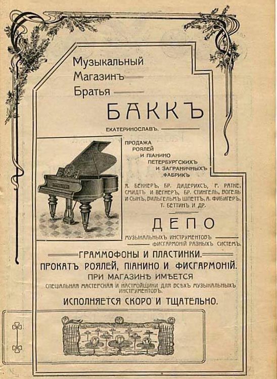 Виявилося, що ця будівля - один із самих маленьких дохідних будинків Катеринослава. Він належав братам Йосифу та Лейзеру Бакк, які були власниками музичного магазину. Саме тому стіни та стелю прикрашала ліпнина з фігурками музичних інструментів.