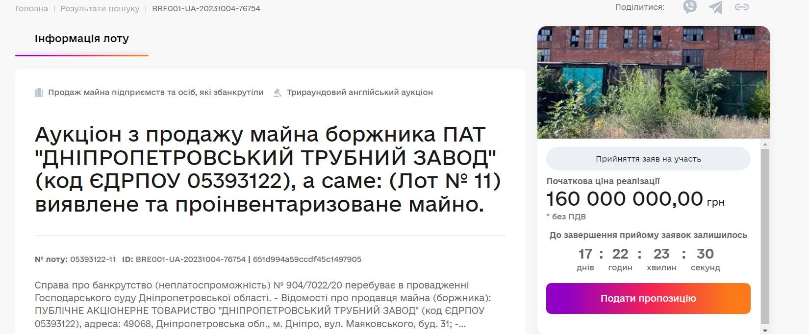 Мова йде про Дніпропетровський трубний завод, який офіційно визнали банкрутом у 2021 році. Раніше частину приміщень колись промислового гіганта виставляли на аукціон за 250 тисяч гривень. Тепер збираються допродати виявлене та проінвентаризоване майно.