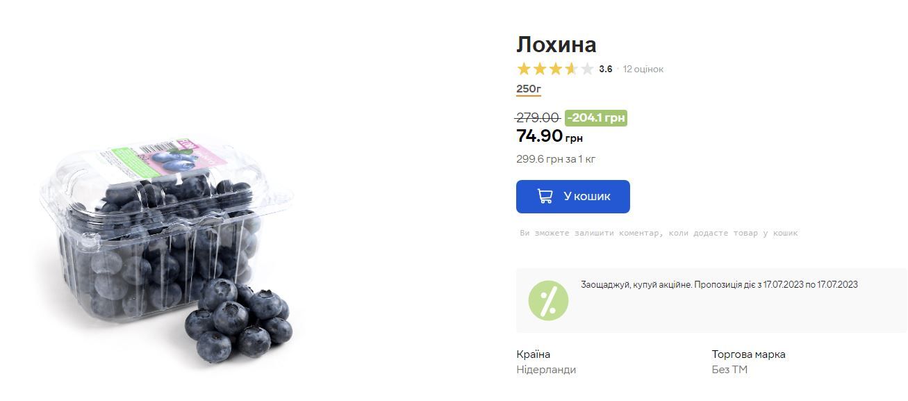 Найдорожче ягода коштує в супермаркеті Сільпо. Ціна кілограма лохини складає майже 300 гривень. 250 грамів обійдеться в 75 гривень.