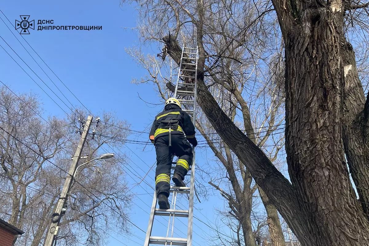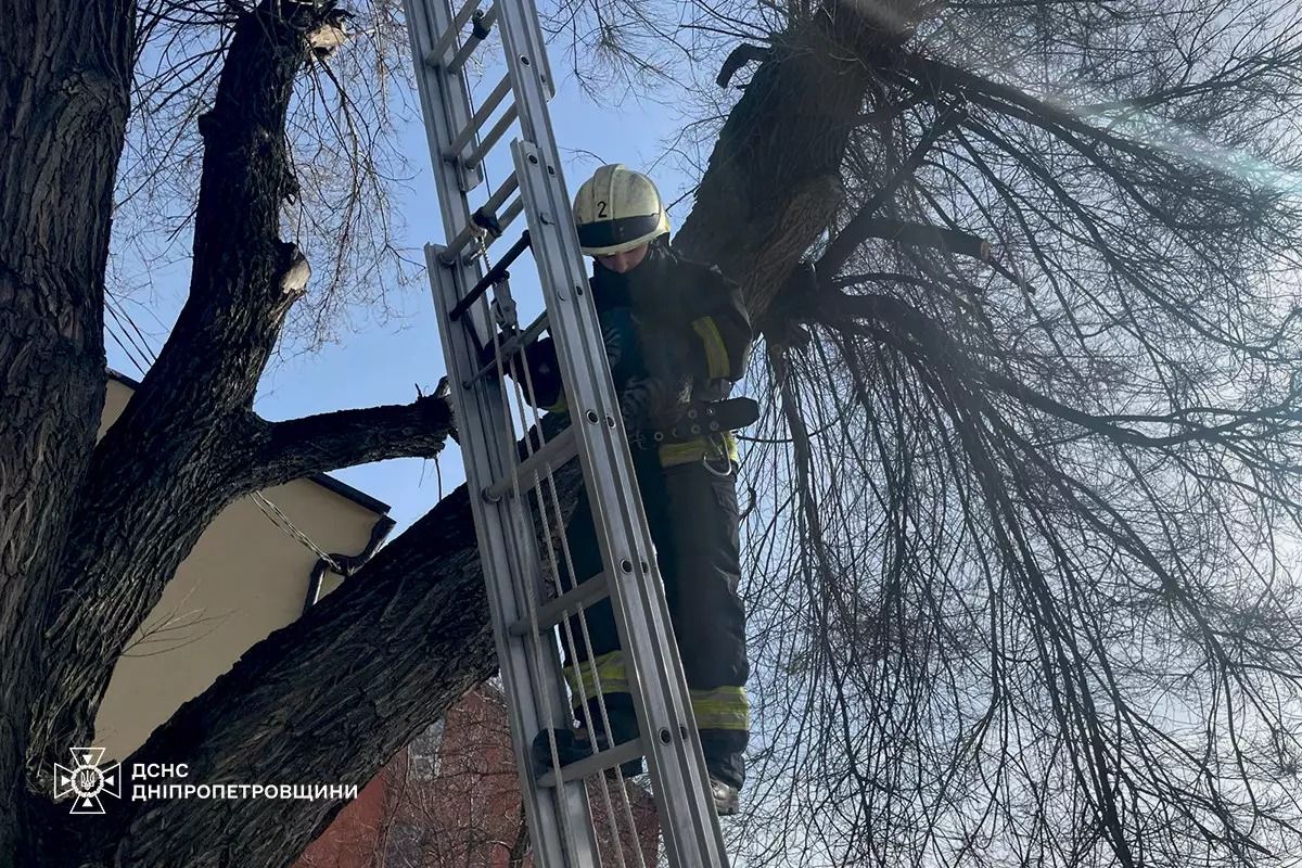 У Дніпрі рятували котика, який заліз на високе дерево та не зміг самостійно спуститись (ФОТО)