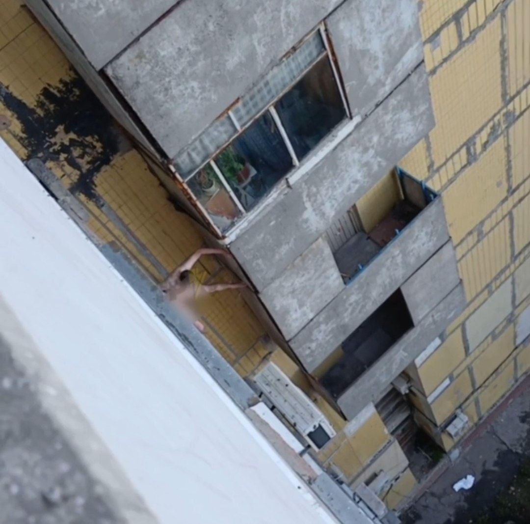 На відео, яке ширять у мережі видно, що оголений незнайомець "застряг" між двома частинами багатоповерхівки. Чоловік сидів на поруччях одного із балконів на висоті шостого поверху, і ймовірно, намагався залізти в чуже помешкання.