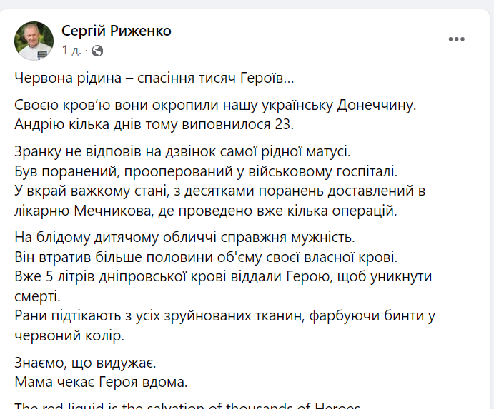 На блідому дитячому обличчі справжня мужність. Він втратив більше половини об'єму своєї власної крові. Вже 5 літрів дніпровської крові віддали Герою, щоб уникнути смерті. Рани підтікають з усіх зруйнованих тканин, фарбуючи бинти у червоний колір. Знаємо, що видужає. Мама чекає Героя вдома, - написав генеральний директор.