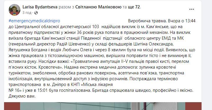 36-річна жінка втратила два пальці, коли намагалася поправити тісто, не вимкнувши тістомісильну машинку. До місця події через 8 хвилин прибула бригада Кам’янської станції Південної підстанції ОЦ ЕМД та МК. Постраждалу оглянули та діагностували травматичну ампутацію ІІ-V пальців правої кисті, перелом п’ясних кісток.