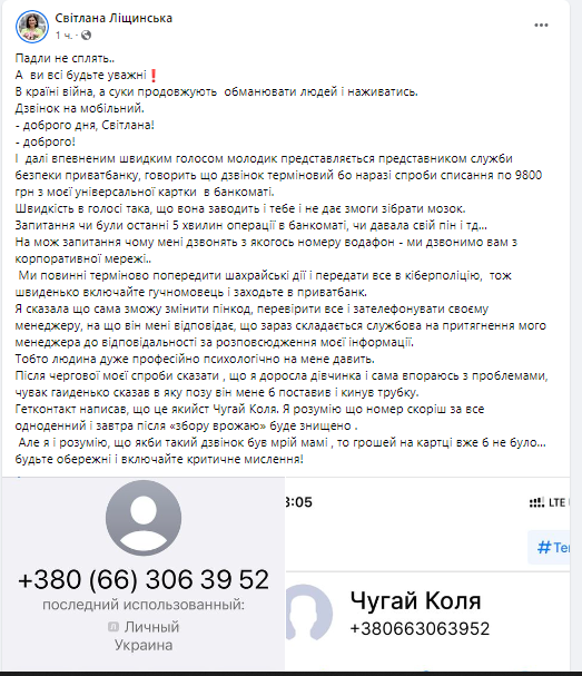 Швидкість в голосі така, що вона заводить тебе і не дає змоги зібрати мозок. Запитання, чи були останні 5 хвилин операції в банкоматі, чи давала свій пін тощо. На моє запитання, чому дзвонять з якогось номеру водафон - ми дзвонимо вам з корпоративної мережі, - пише Світлана.