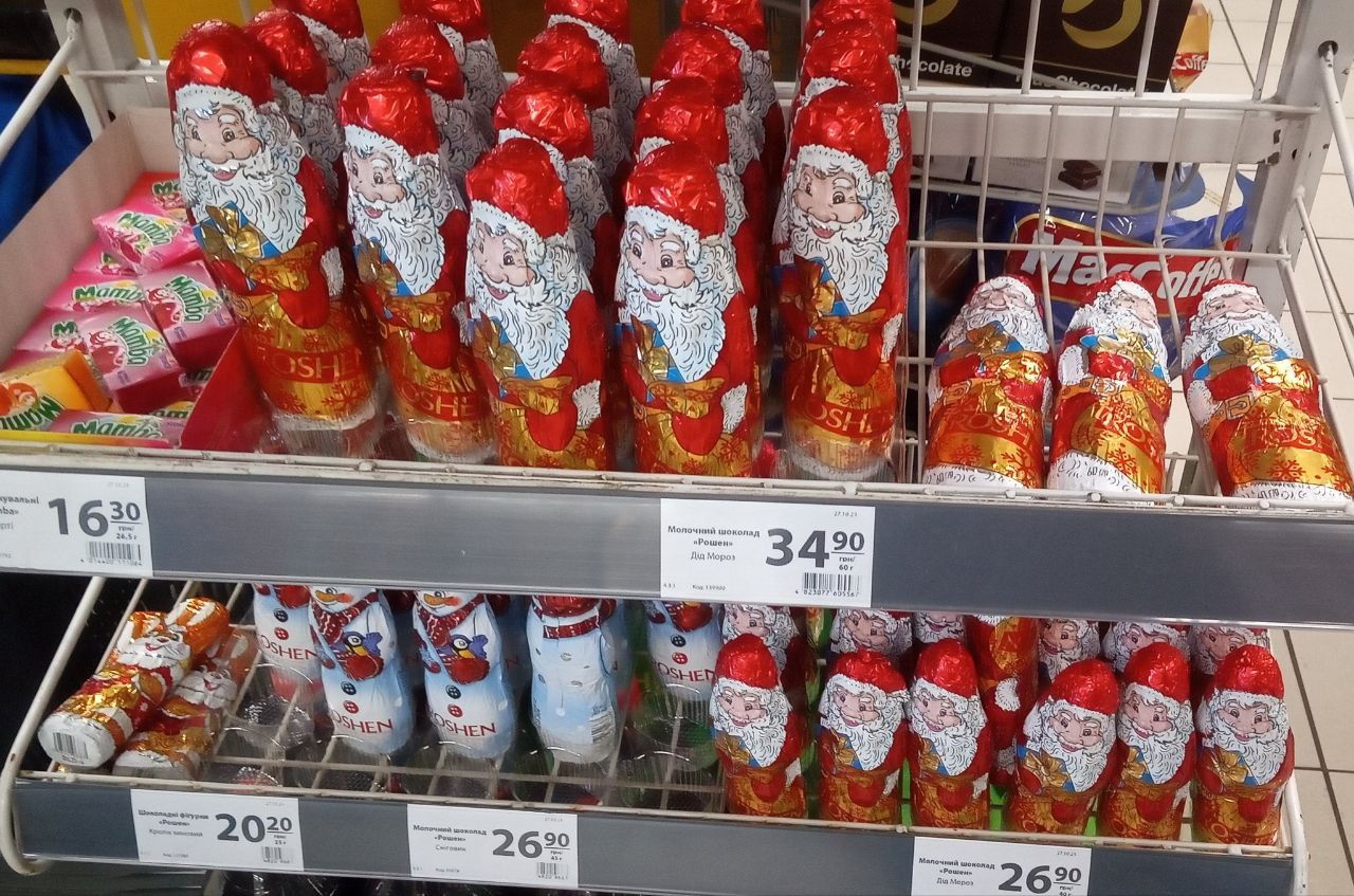 Що цікаво у магазинах також з'явилися новорічні подарункові набори та шоколадні Діди Морози.
