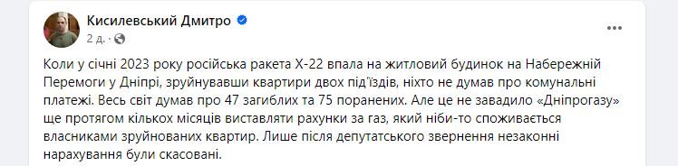 Мова йде про власників квартир у частково зруйнованому будинку на Набережній Перемоги, куди у січні 2023 року влучила російська ракета. Як виявилося, мешканці помешкань, яких вже не існує, отримували рахунки за газ.