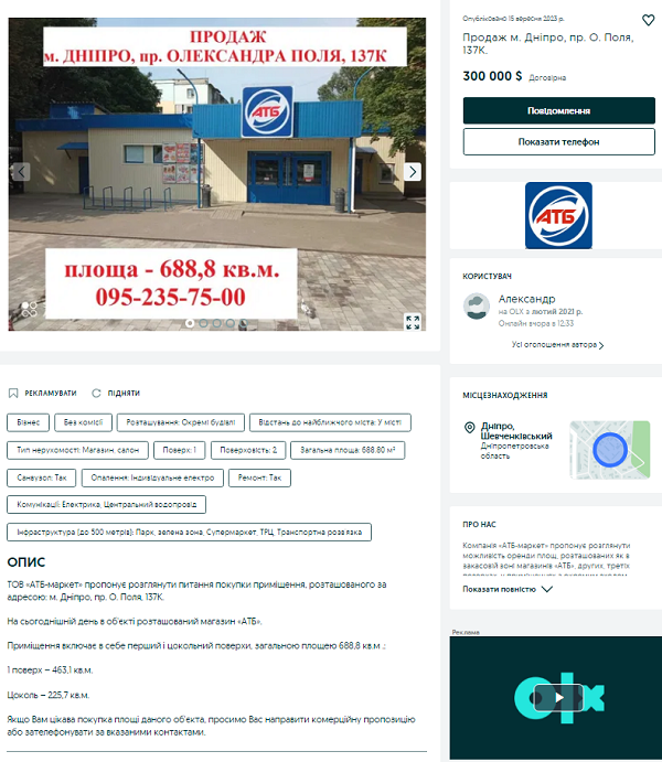 Торгова мережа АТБ продає один із своїх магазинів у Дніпрі. Будівля знаходиться на проспекті Поля, вона двоповерхова, другий поверх – цокольний. Загальна площа всіх приміщень 688,8 кв. м. У приміщення встановлено електроопалення, є всі комунікації.