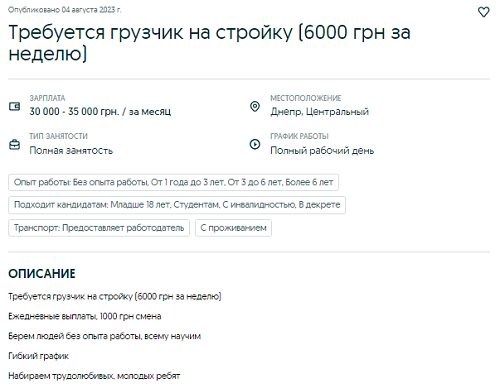 Від 30 до 35 тис грн на місяць у Дніпрі може заробити вантажник на будівництві. За зміну обіцяють платити тисячу гривень. Працювати потрібно буде з понеділка до суботи включно. Обіцяють також навчання. Головне – бажання працювати.