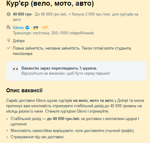 До 40 тис грн може заробити кур'єр служби доставки без досвіду роботи. Головне, щоб у нього був велосипед, моторолер, мотоцикл чи авто. Обіцяють гнучкий графік, страховку на час роботи та щоденні виплати.