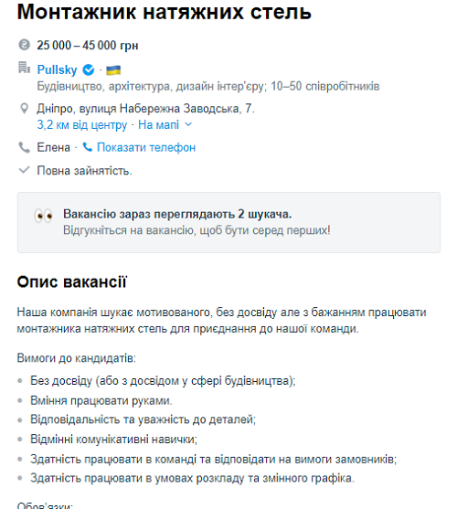Від 25 до 45 тис грн готові платити монтажнику натяжних стель. Серед вимог до кандидата наявність досвіду роботи не є обов'язковою, головне – вміти працювати руками, бути уважним до деталей, працювати в команді та прислухатися до думки клієнта.