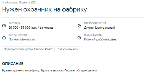 Охоронець на фабриці може заробити від 20 до 35 тис грн на місяць. Подробиці обіцяють розповісти телефоном. Працювати потрібно буде повний робочий день.