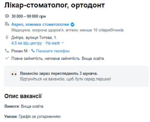 Лікар-стоматолог із вищою освітою може заробити у Дніпрі від 30 до 90 тис грн. В оголошенні про вакансію сказано, що головна вимога – це освіта, а решта – можна обговорити під час зустрічі з роботодавцем.