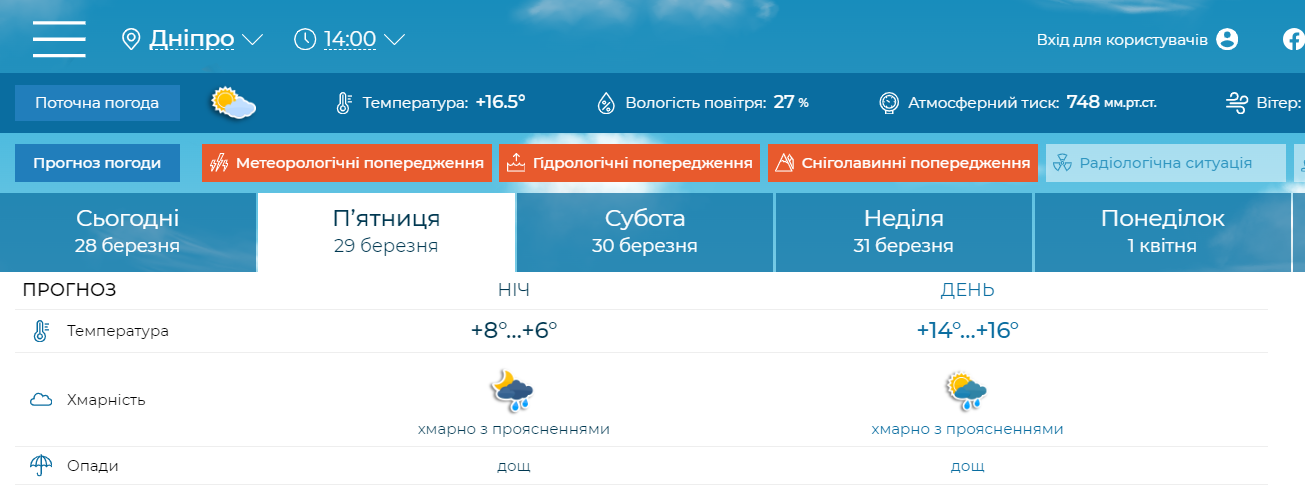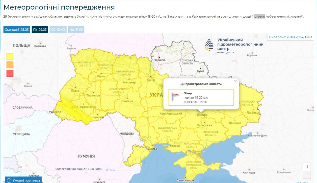29 березня вночі у західних областях, вдень в Україні, крім північного-сходу, пориви вітру 15-20 м/с; на Закарпатті та в Карпатах вночі та вранці значні дощі (І рівень небезпечності, жовтий), - йдеться у повідомленні Укргідрометцентру.