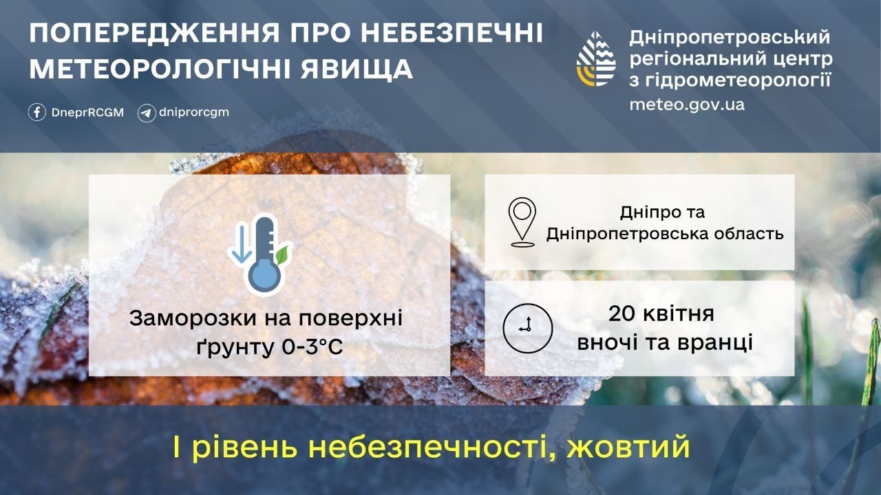 За даними Дніпровського гідрометцентра, 20 квітня вночі та вранці у м. Дніпро та по Дніпропетровській області очікуються заморозки на поверхні ґрунту та місцями в повітрі 0..3°. Рівень небезпечності I (жовтий).