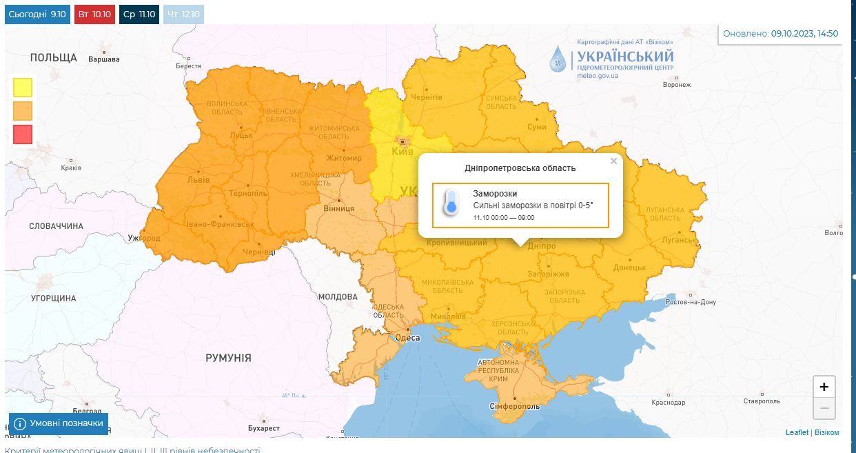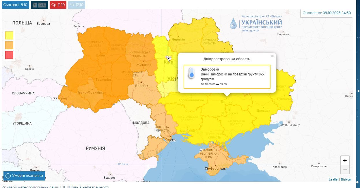 У Дніпрі на два дні оголосили помаранчевий рівень небезпеки. 10 жовтня очікуються заморозки на ґрунті, що є проблемою для фермерів, які ще не прибрали деякий урожай.