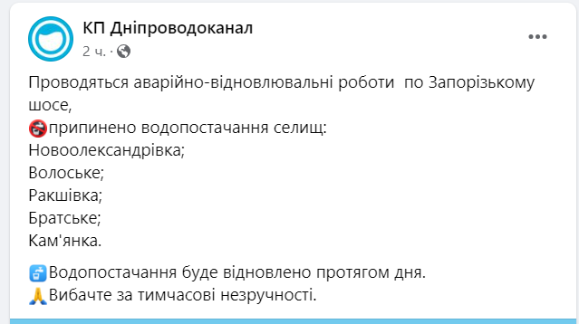 Також проводяться аварійно-відновлювальні роботи на Запорізькому шосе, тому припинено водопостачання селищ: