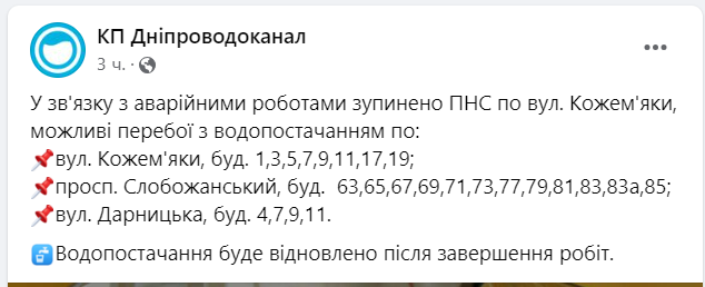 Так, у зв'язку з аварійними роботами зупинено ПНС на вул. Кожем'яки. Тому можливі перебої з водопостачанням на: