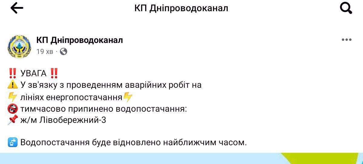 18 жовтня, у зв'язку з проведенням аварійних робіт на лініях енергопостачання тимчасово припинено водопостачання житлового масиву Лівобережний-3.