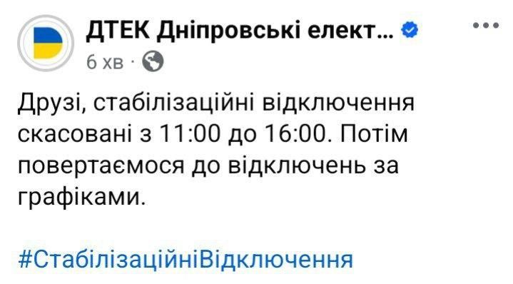 Тож і для абонентів ЦЕК, і для споживачів ДТЕК графіки відключень не діятимуть з 11:00 до 16:00.