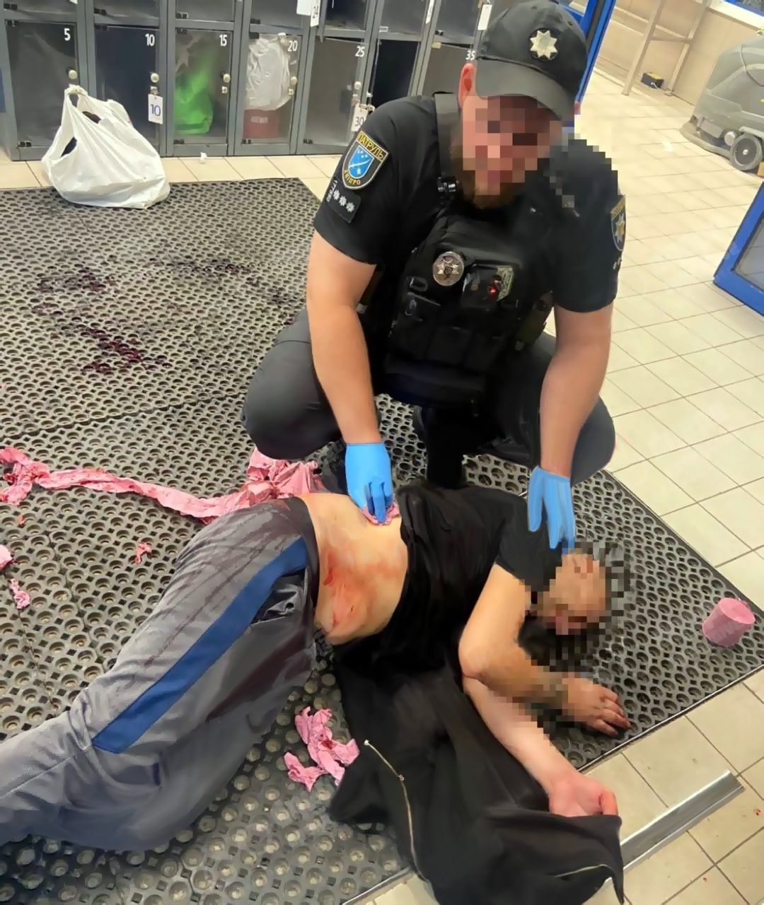 На одному з фото, яким поділилися у мережі видно калюжі крові та пораненого чоловіка, якому поліціянт надає першу допомогу підручними засобами. Імовірно, постраждалого було поранено у бік, ближче до ребер, а також можна помітити колоті рани на животі.