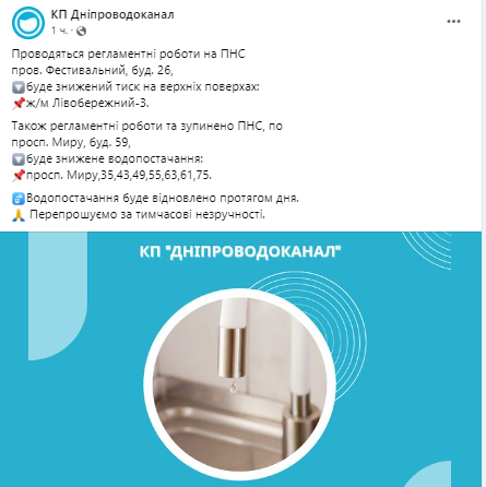 Також через регламентні роботи зупинено ПНС на просп. Миру, 59. Тому буде знижене водопостачання: