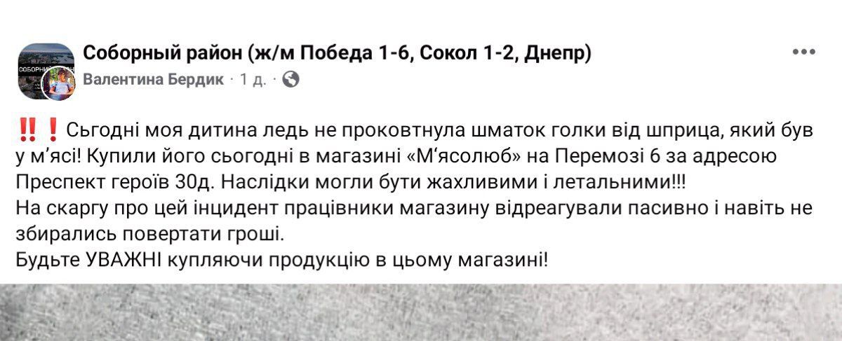 У коментарях до посту дніпряни теж скаржилися на цей магазин. Місцеві мешканці розповідають, що продавці наколюють м'ясні вироби рідиною, щоб ті важили більше. Напевне, саме тому всередину шматка свинини потрапила голка.