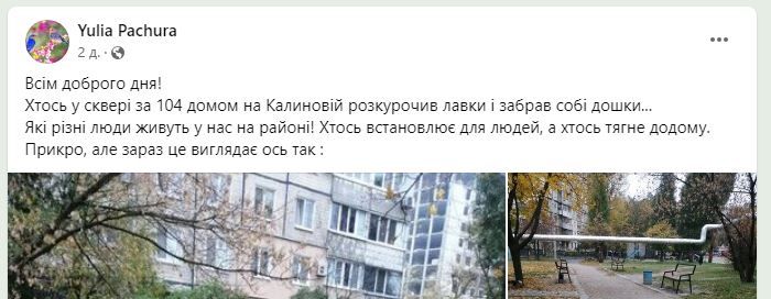 Всім доброго дня! Хтось у сквері за 104 домом на Калиновій розкурочив лавки і забрав собі дошки. Які різні люди живуть у нас на районі! Хтось встановлює для людей, а хтось тягне додому. Прикро, але зараз це виглядає ось так, - пише дніпрянка у спільноті на Facebook.